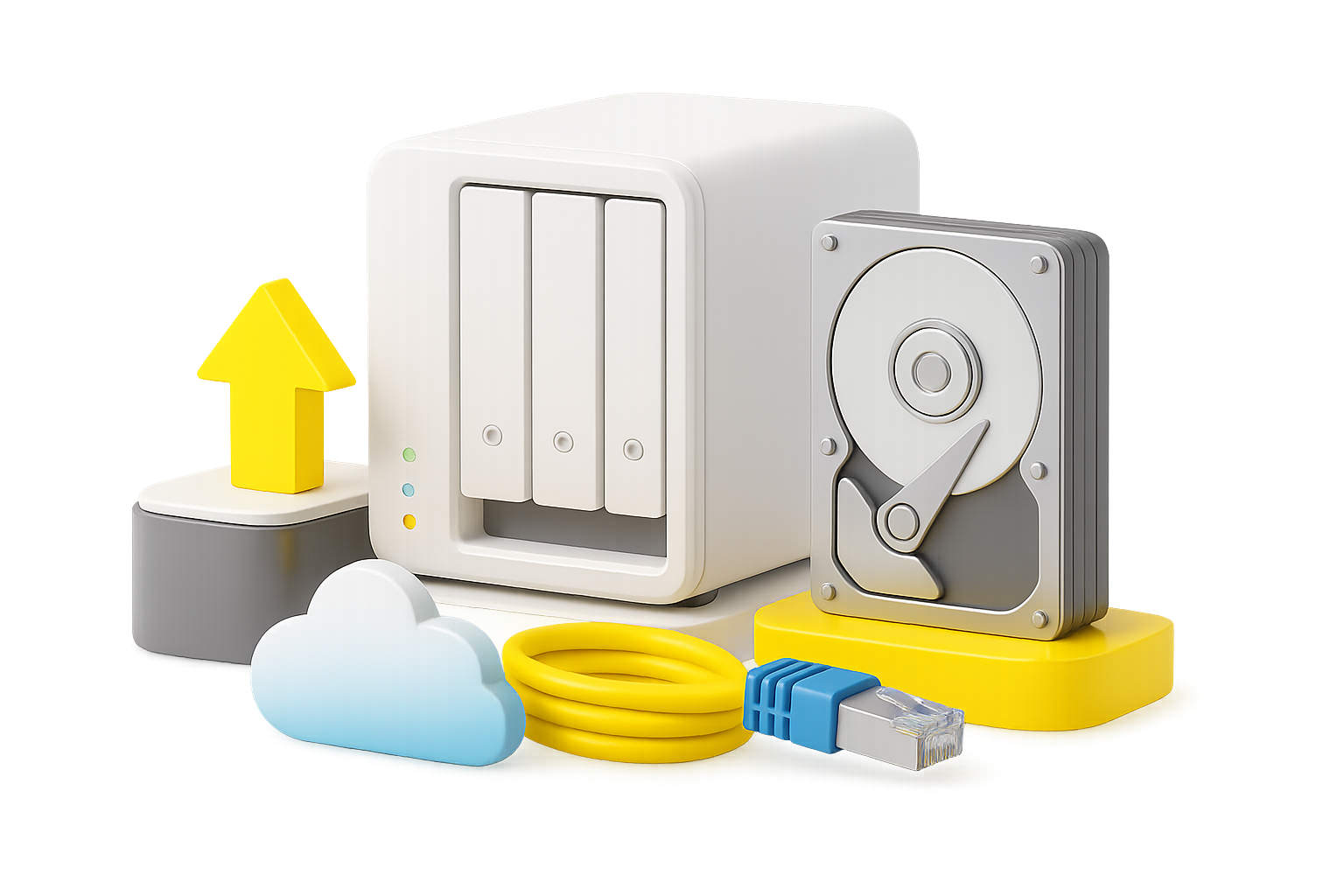 Основной элемент хранения данных. NAS обычно используют 3,5-дюймовые или 2,5-дюймовые жёсткие диски, оптимизированные для работы 24/7. Некоторые модели поддерживают SSD для увеличения скорости.